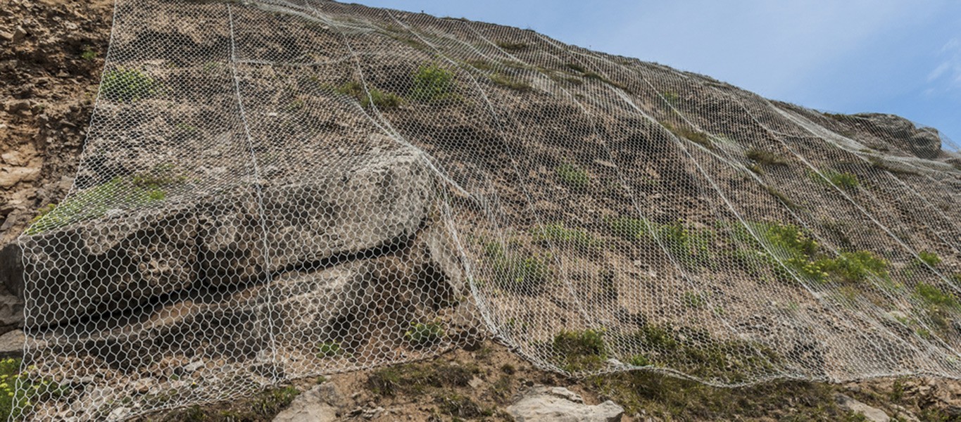 Geotech Erosion Matt made from PP fiber (green color) and Galvanized steel wire mesh for protection land slice corrosion of soil and pavement.